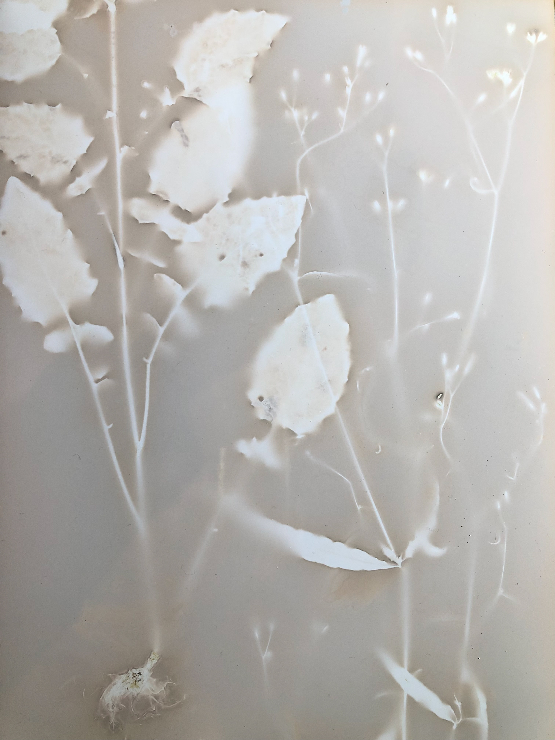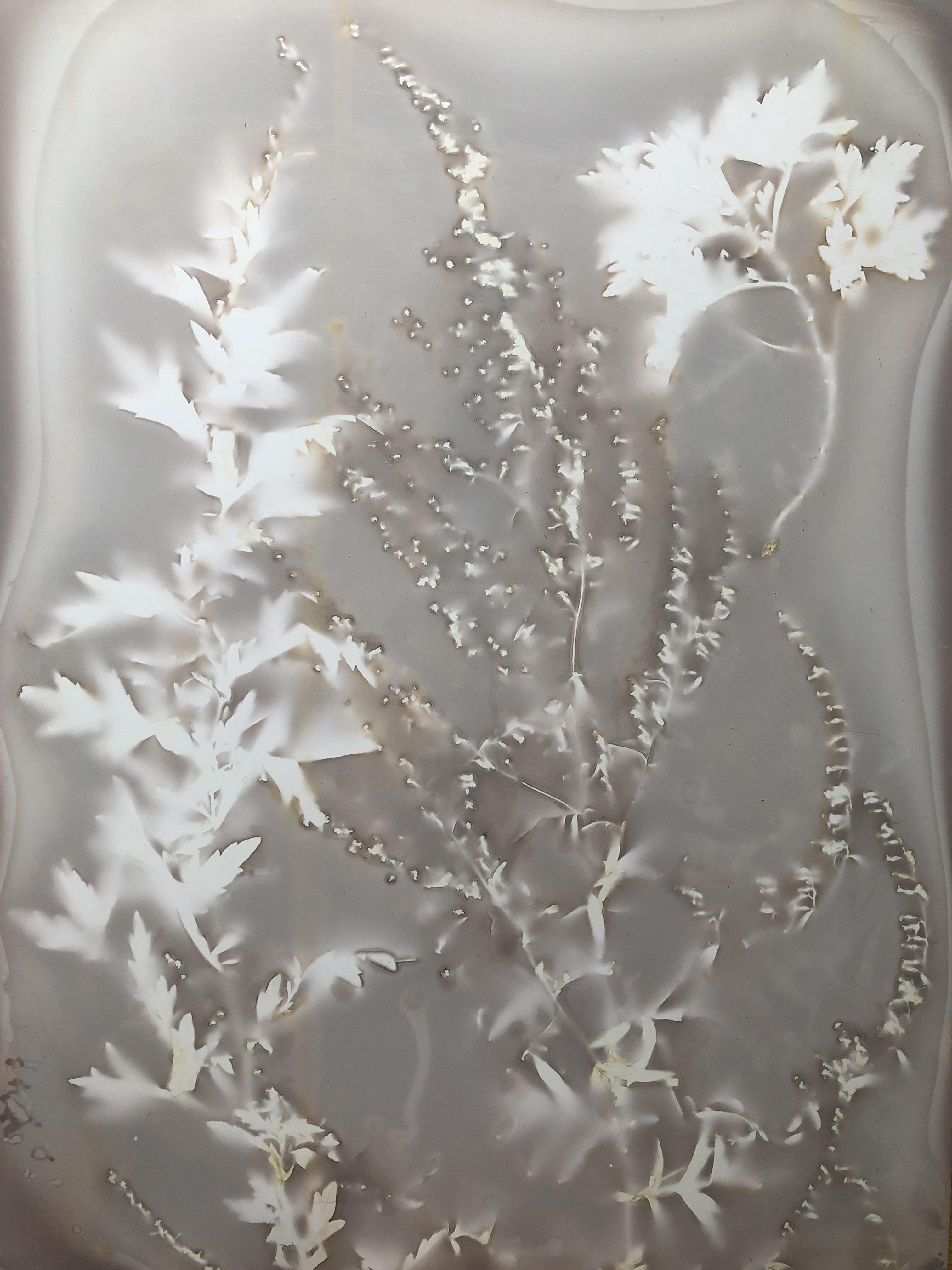 ‘De l’autre côté de la rivière’ est un projet de documentation et de récoltes, inspiré des recherches des botanistes du XIVème siècle à nos jours. Le processus résulte d’une analyse de la flore naturellement présente sur un site déterminé. Des spécimens de végétaux sont prélevés afin de pouvoir donner un maximum d’informations sur la plante. Ils sont ensuite placés dans un dispositif photographique sans boîtier qui permet de révéler l’essence du spécimen sur papier uniquement avec la lumière du soleil.